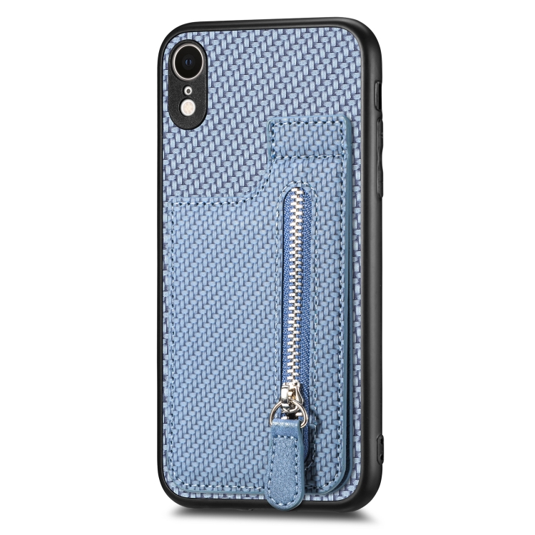 Funda de teléfono para iPhone Xr con cremallera vertical de fibra de carbono (Azul)
