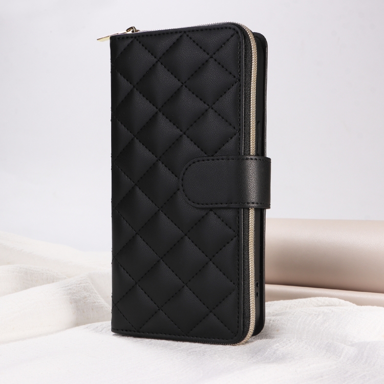 Funda para Teléfono iPhone Xr Cuero Hebilla Torre Cremallera Rómbica Cruzada con Cordón (Negro)