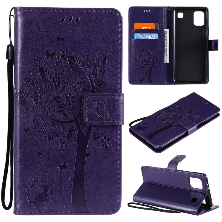 Funda Cuero Flip LG K52 Árbol y Gato Patrón con Soporte, Ranuras y Cordón (Púrpura)