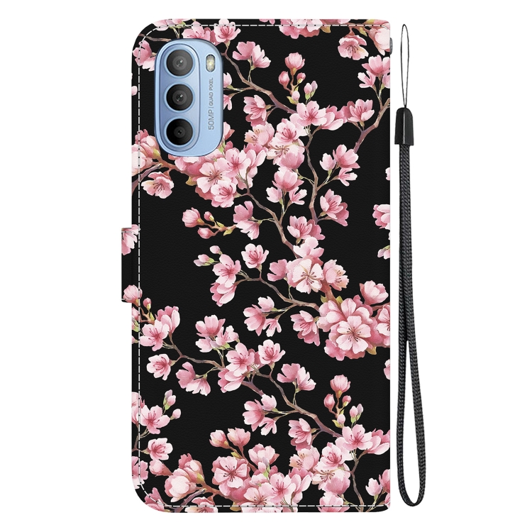 Funda de Cuero para Motorola Moto G31 / G41 con Dibujo Coloreado y Textura de Cristal (Flor de Ciruelo)