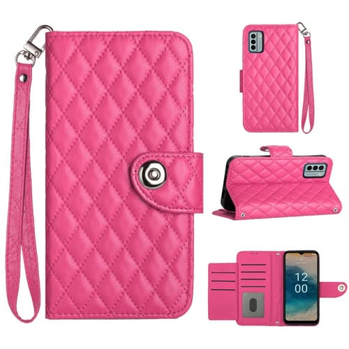 Funda para Teléfono Nokia G22 de Cuero con Tapa Textura Rómbica y Cordón (Rojo Rosa)