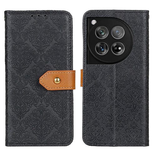 Funda para OnePlus 12 de Cuero con Tapa y Relieve Floral Europeo (Negro)
