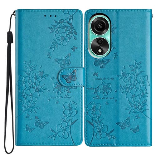 Para Oppo A58 4G Global Butterfly Love Flower Funda de Cuero para Teléfono En Relieve (Azul)