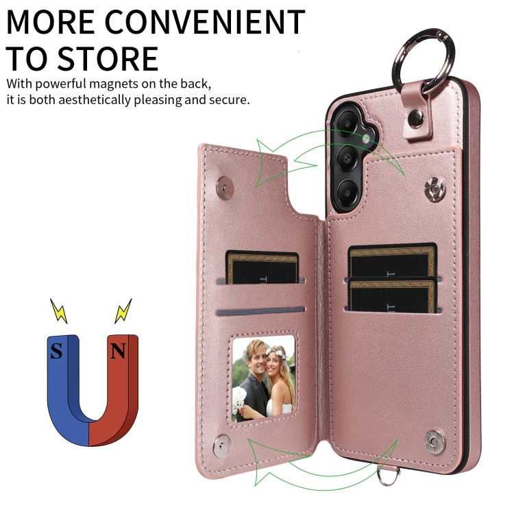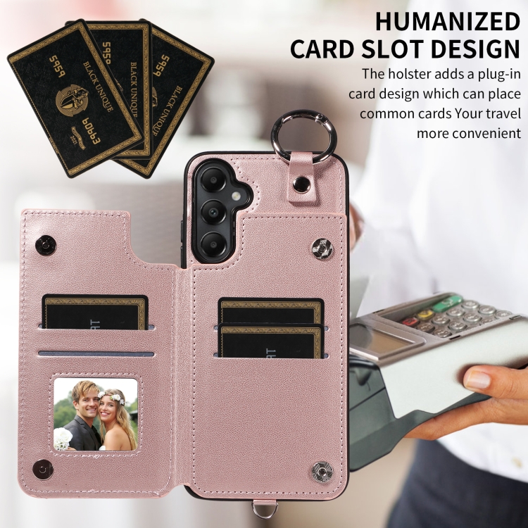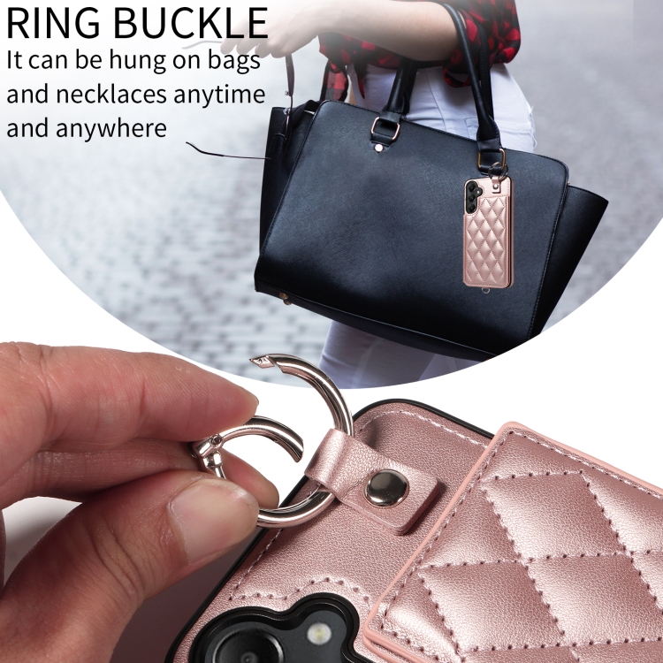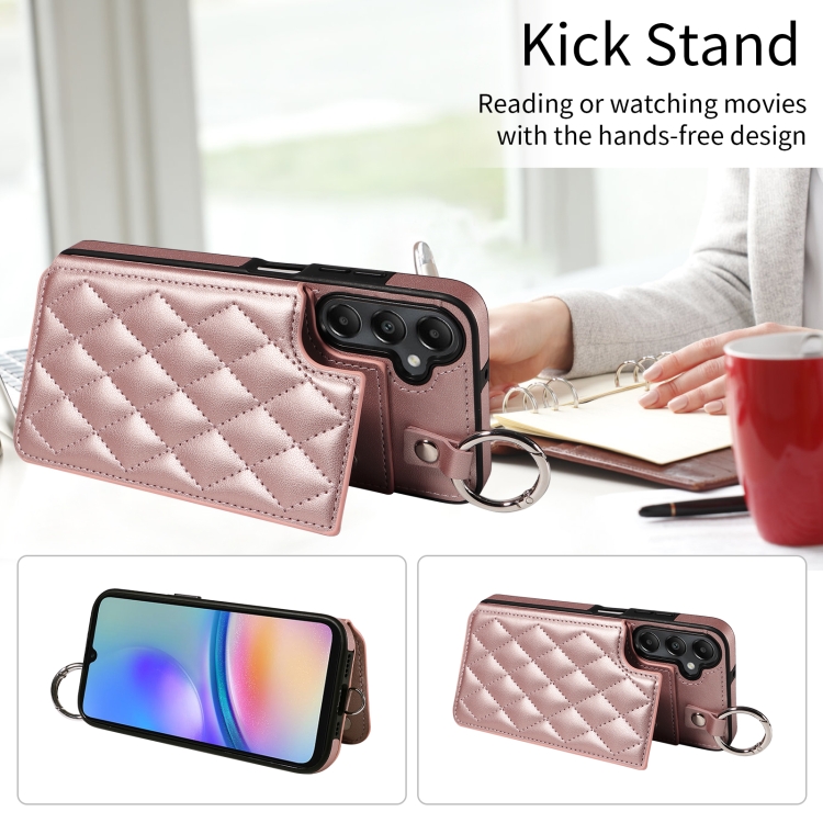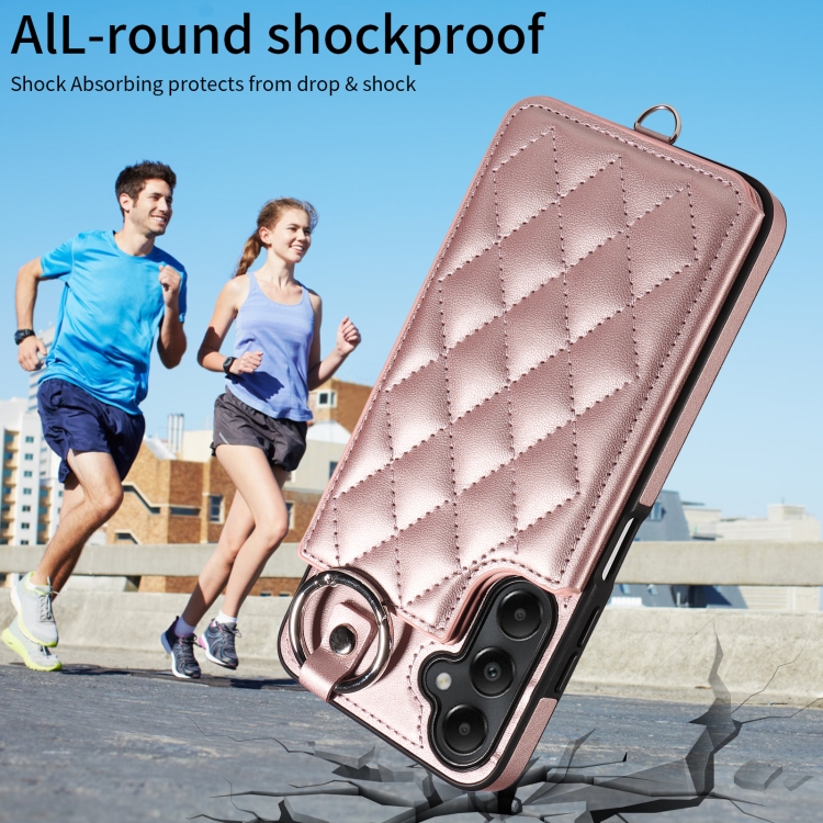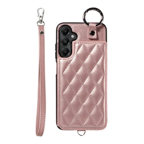 Estuche para Teléfono Samsung Galaxy A05S con Bolsa para Tarjetas Textura Rómbica y Cordón Corto (Oro Rosa)