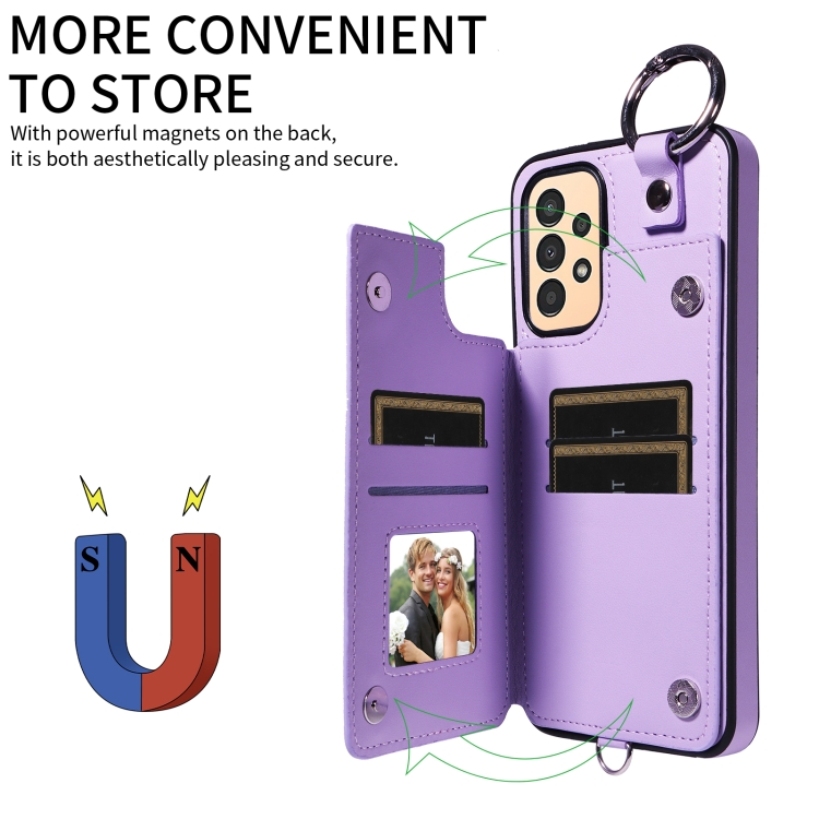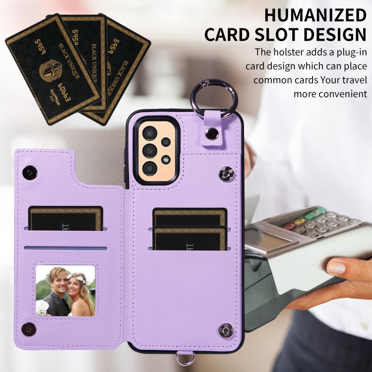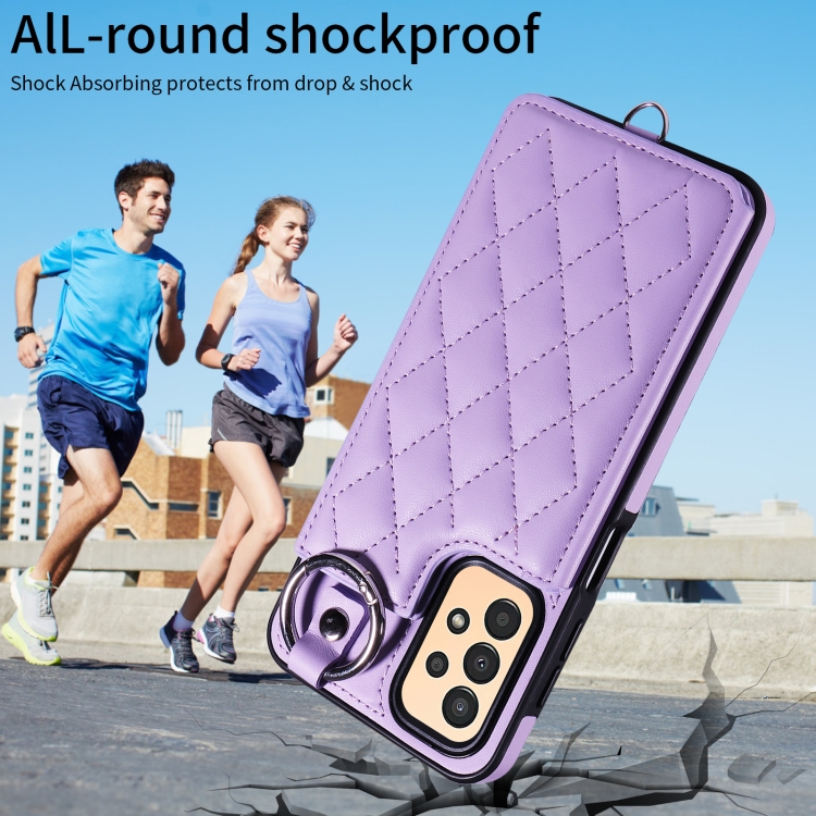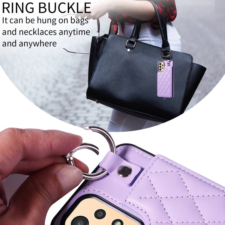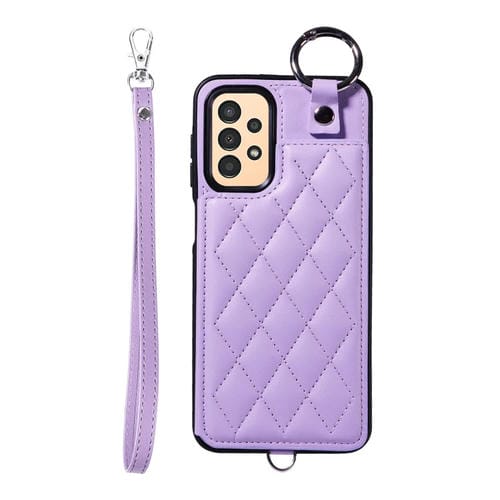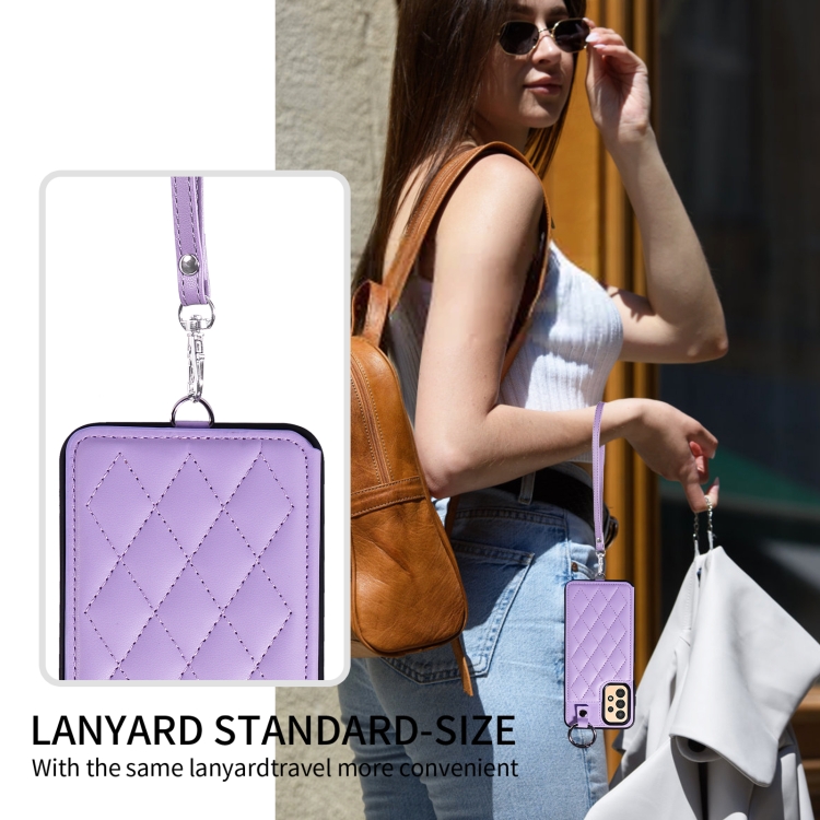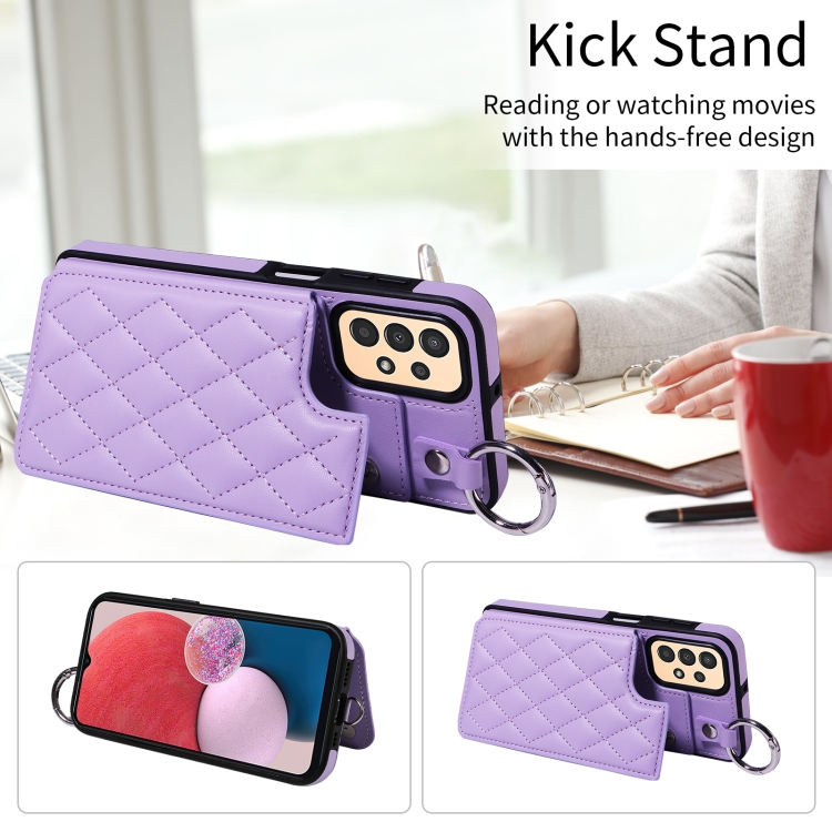 Estuche para teléfono Samsung Galaxy A13 4G y 5G con bolsa para tarjetas textura rómbica y cordón corto (Púrpura)