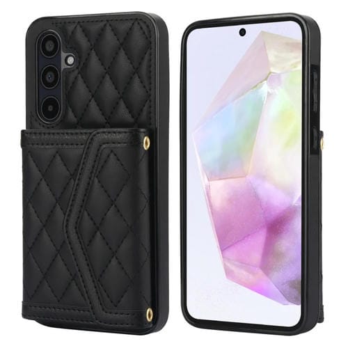 Estuche para Teléfono Samsung Galaxy A35 5G con Bolsa para Tarjetas Textura Rómbica y Cordón Largo (Negro)