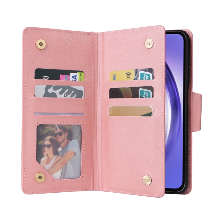 Funda de Cuero para Samsung Galaxy A55 con Remache Hebilla y Billetera 3 Pliegues 9 Tarjetas (Oro Rosa)