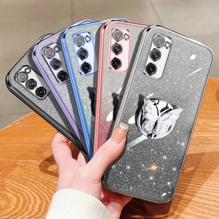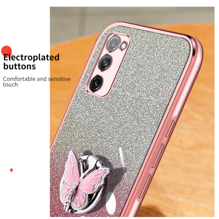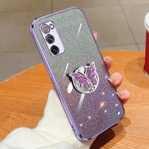 Estuche para teléfono Samsung Galaxy S20 FE TPU con soporte de mariposa y brillo degradado (Púrpura)