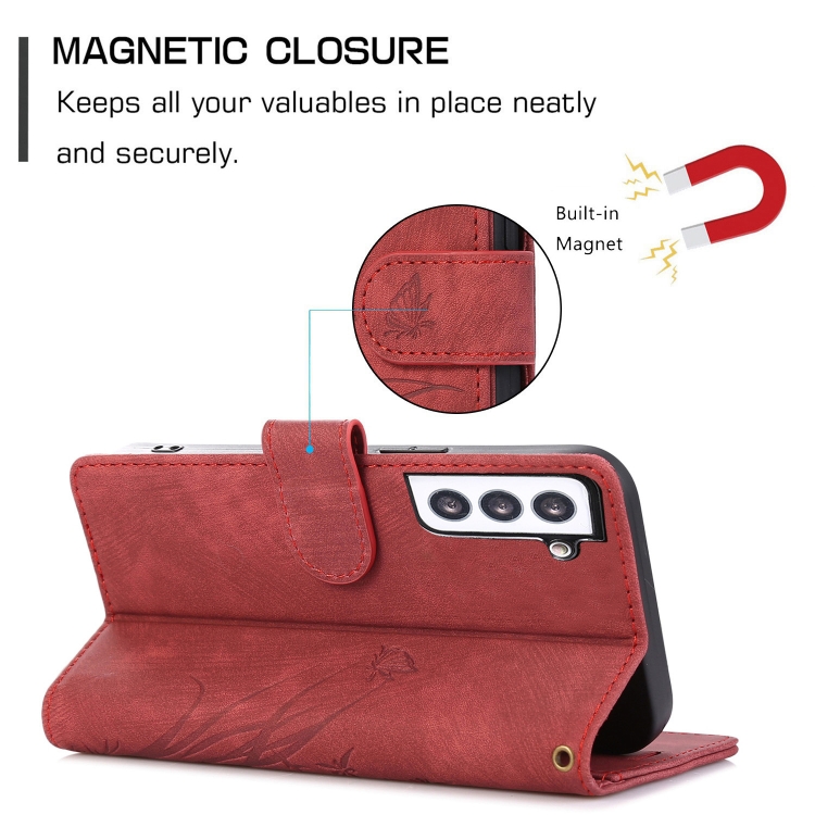 Funda para Teléfono Samsung Galaxy S21 FE 5G Cuero Relieve Mariposa Orquídea (Rojo)