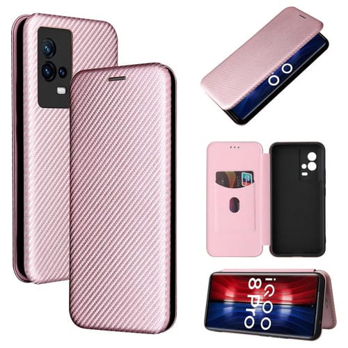 Para Vivo Iqoo 8 Pro Carbono Textura de Fibra de Carbono Magnético Horizontal Flip TPU + PC + Funda de Cuero Pu con Ranura para Tarjeta (Rosa)