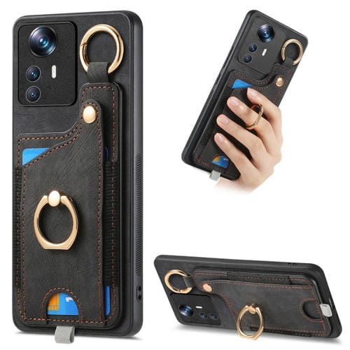 Para Xiaomi 12T Pro Funda para Teléfono con Bolsa para Tarjeta con Anillo y Sensación de Piel Retro con Lazo para Colgar (Negro)