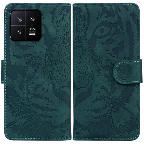 Para Xiaomi 13 5G Caja del Teléfono de Cuero con Estampado de Tigre En Relieve (Verde)