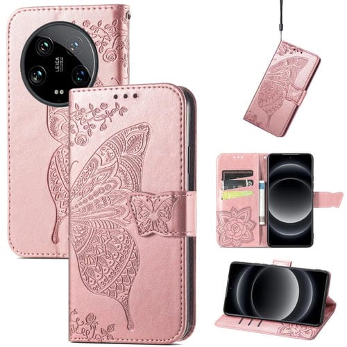 Para Xiaomi 14 Ultra Butterfly Love Flower Funda De Cuero Para Teléfono En Relieve (Oro Rosa)