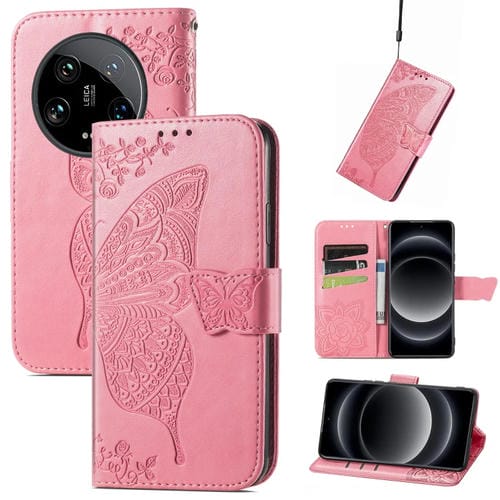 Para Xiaomi 14 Ultra Butterfly Love Flower Funda De Cuero Para Teléfono En Relieve (Rosa)