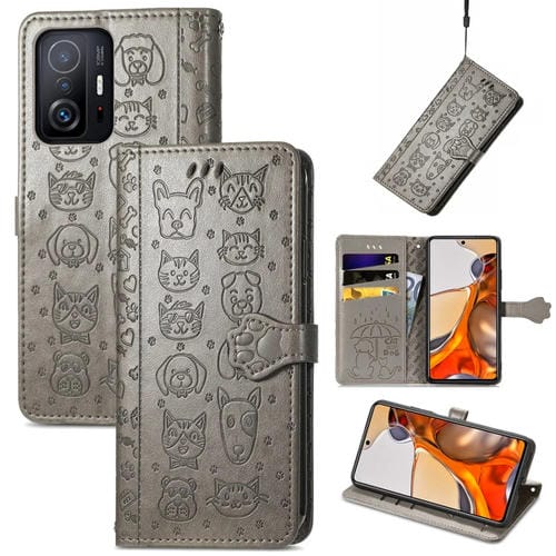 Para Xiaomi Mi 11T / 11T Pro Cat y Estuche de Cuero Horizontal En Relieve para Perros con Soporte y Ranura para Tarjeta y Billetera y Cordón (Gris)