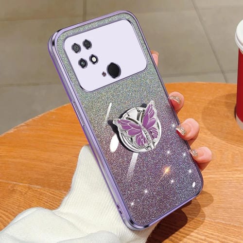 Para Xiaomi Poco C40 Funda para Teléfono de TPU con Soporte de Mariposa con Brillo Degradado Plateado (Púrpura)