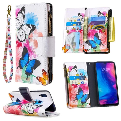 Para Xiaomi Redmi Note 7 Patrón de Dibujo de Colores Cremallera Funda de Cuero con Tapa Horizontal con Soporte, Ranuras para Tarjetas y Billetera (Dos Mariposas)