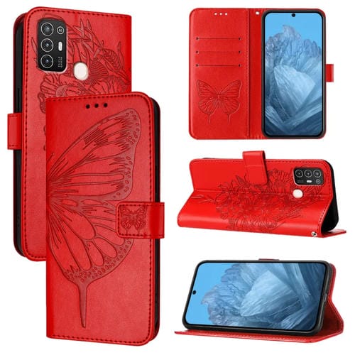 Funda de Cuero para ZTE Blade A52 con Mariposa en Relieve (Rojo)