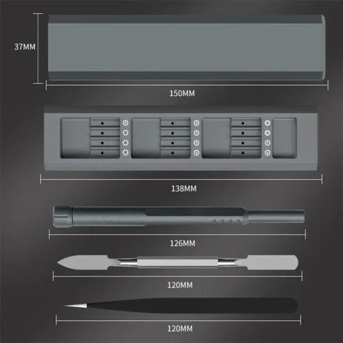 El Juego de destornilladores de precisión 44 en 1 es una herramienta diseñada para el desmontaje y reparación de ordenadores y Teléfonos Móviles, así como otros dispositivos electrónicos de precisión. Este set profesional incluye una amplia variedad de puntas intercambiables fabricadas en acero para herramientas de aleación S2, con tratamiento de superficie gris fosfatado para mayor durabilidad y resistencia al desgaste. El mango está elaborado en aleación de aluminio, ofreciendo un agarre cómodo y seguro, con un diseño tipo empuje que facilita su uso. Además, cuenta con ranura magnética para una adsorción efectiva de las cabezas, evitando caídas accidentales durante el trabajo. Este kit es compatible con múltiples dispositivos electrónicos y es ideal para usuarios que reparan por cuenta propia, técnicos y profesionales del sector.