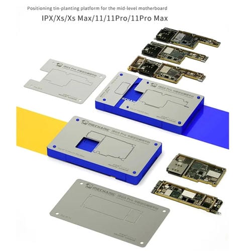 La Plataforma de Estaño Mechanic iBGA Pro 6 en 1 es una herramienta de posicionamiento de nivel medio diseñada para facilitar la reparación y replantación de componentes electrónicos en dispositivos Móviles. Compatible principalmente con modelos de iPhone X, XS, XS Max, 11, 11 Pro y 11 Pro Max, esta plataforma permite un posicionamiento automático magnético preciso gracias a su sistema de adsorción magnética fuerte, garantizando una alineación exacta sin necesidad de compensación manual. Su función principal es ofrecer un Soporte seguro para el proceso de soldadura y replantación de chips, incorporando una Placa a prueba de fugas de estaño que protege la Placa Base del Teléfono durante la reparación. Construida con material de malla de acero especial resistente a altas temperaturas de hasta 500 grados Celsius, esta plataforma mantiene su integridad sin deformaciones ni abultamientos, asegurando durabilidad y precisión en cada uso.