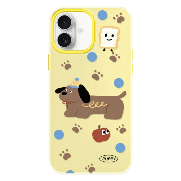 Funda híbrida TPU y PC iPhone 16 Plus Tacto Sedoso (Cachorro Amarillo y Blanco)