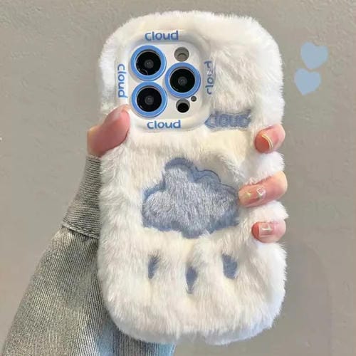 Funda de Teléfono iPhone 16 Pro Cobertura Total Bordado Felpa (Nube Blanca y Azul)