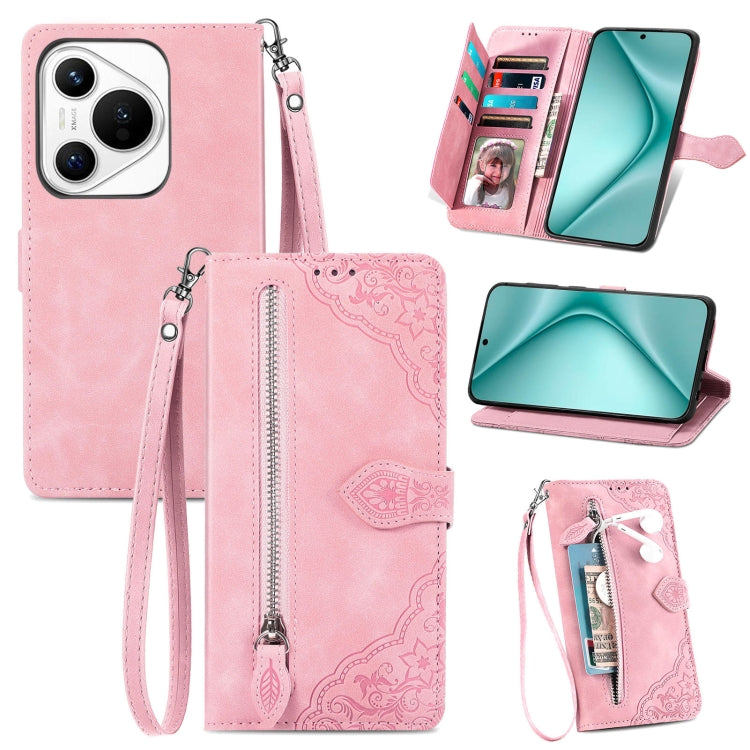Funda de Cuero para Huawei Pura 70 Pro+ con Cremallera y Flores en Relieve (Rosa)