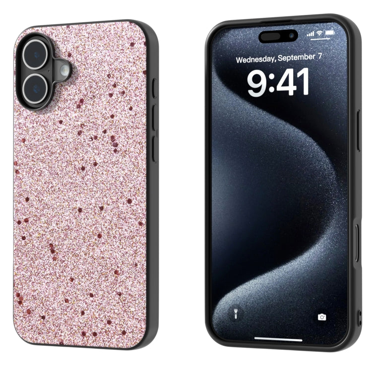 Funda para iPhone 16 con Marco Negro y Purpurina a Prueba de Golpes (Dorado y Rosa)