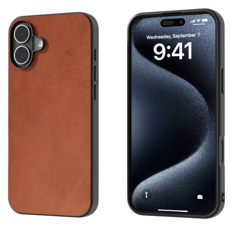 Funda de teléfono PU iPhone 16 textura becerro dos colores marco negro (Marrón)