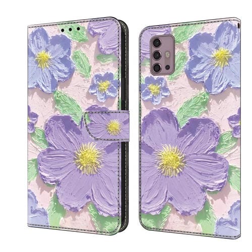 Funda de Cuero Pintada al Óleo para Motorola Moto G30 (Flores Moradas)