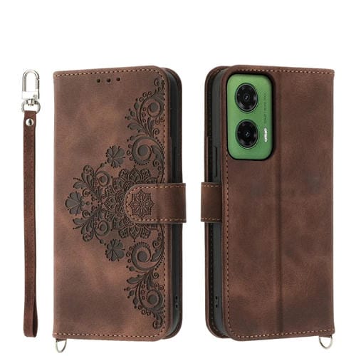 Funda Cuero Tipo Billetera Motorola Moto G55 con Flores en Relieve (Marrón)