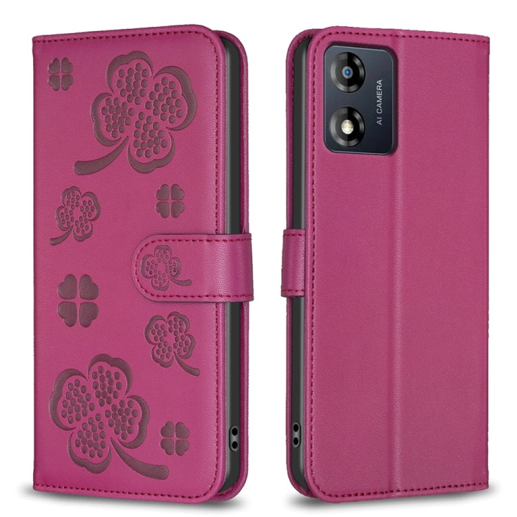 Funda para Motorola Moto E13 4G de Cuero con Relieve de Cuatro Hojas (Rojo Rosa)