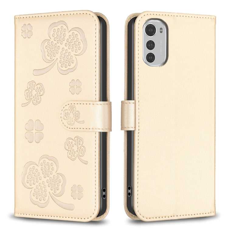 Funda de Cuero para Motorola Moto E32 4G con Relieve de Cuatro Hojas (Dorado)
