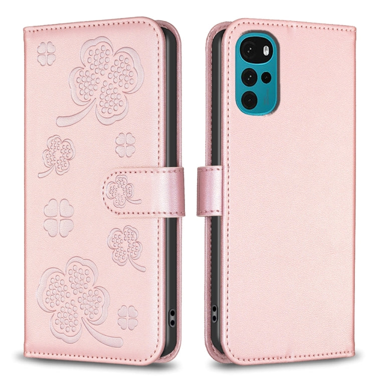 Funda de Cuero para Motorola Moto G22 con Relieve de Cuatro Hojas (Rosa)
