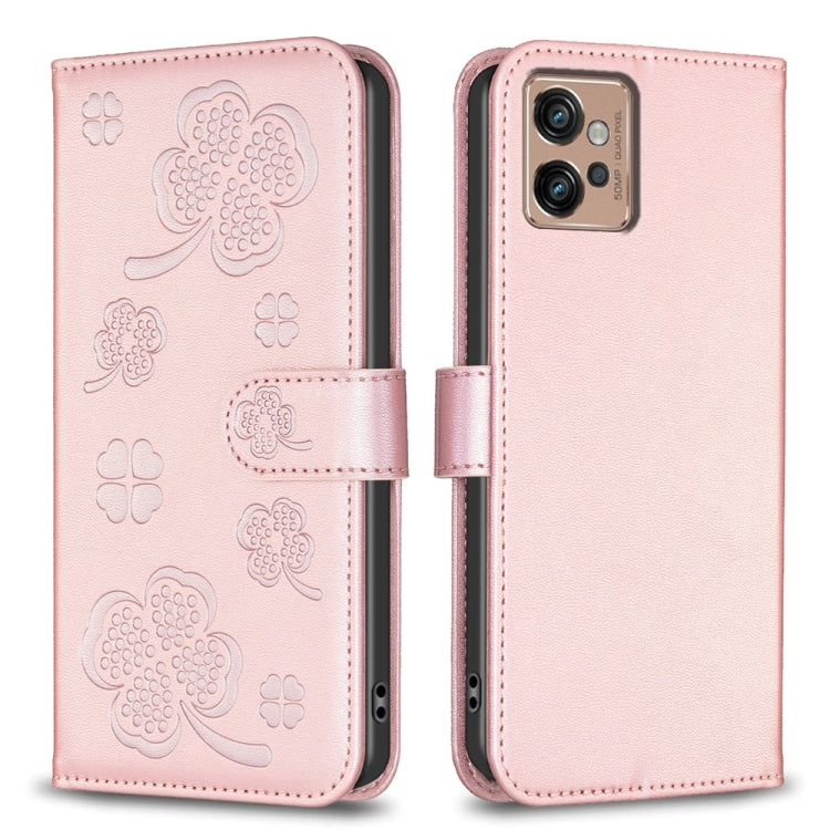 Funda de Cuero para Motorola Moto G32 4G con Relieve de Cuatro Hojas (Rosa)