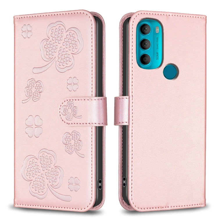 Funda de Cuero para Motorola Moto G71 con Relieve de Cuatro Hojas (Rosa)