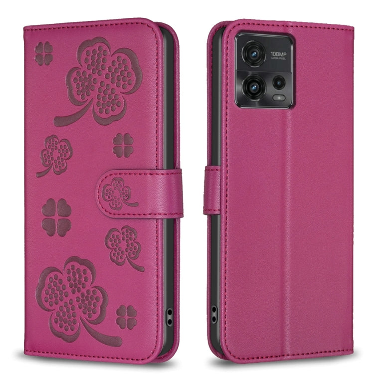 Funda de Cuero para Motorola Moto G22 con Relieve de Cuatro Hojas (Rojo Rosa)
