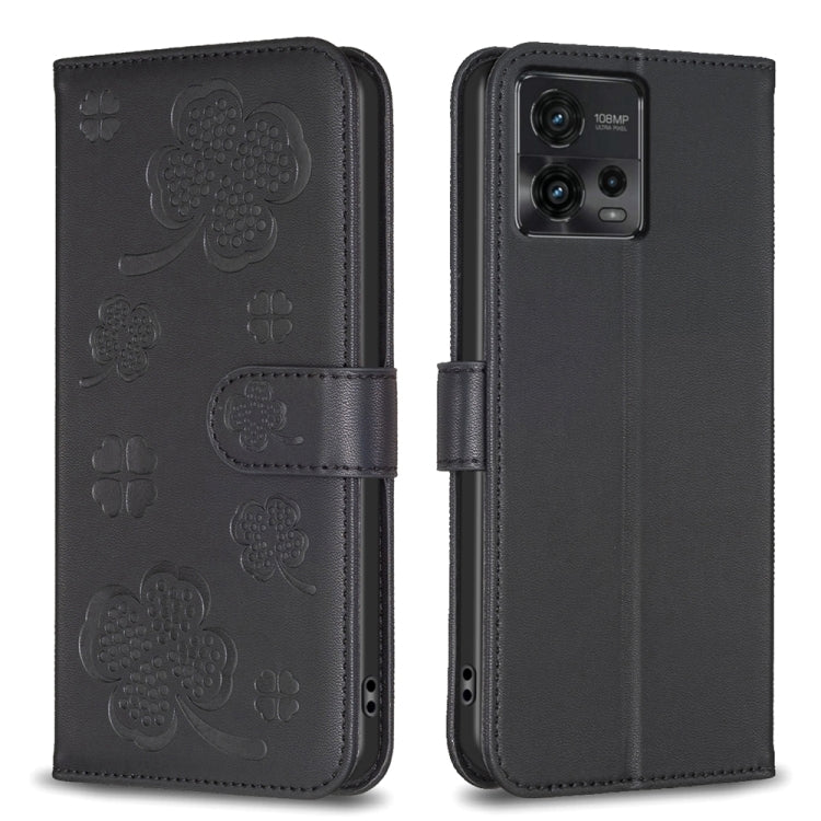 Funda de Cuero para Motorola Moto G72 con Relieve de Cuatro Hojas (Negro)