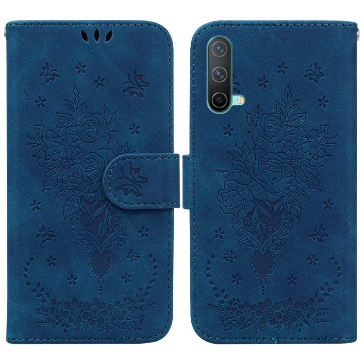 Funda para OnePlus Nord N100 Butterfly Rose Foothip en Relieve de Cuero (Azul)