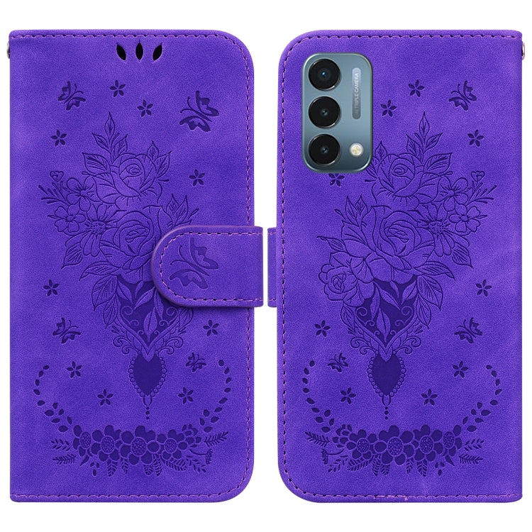 Funda para OnePlus Nord N200 5G Butterfly Rose en Relieve de Cuero (Púrpura)