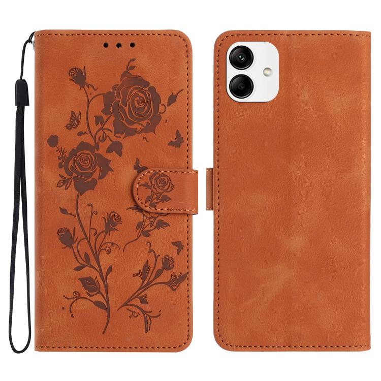 Funda de cuero con estampado de rosas en relieve para Samsung Galaxy A04 (marrón)
