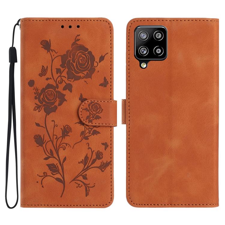Funda de piel con estampado de rosas en relieve para Samsung Galaxy A22 (marrón)