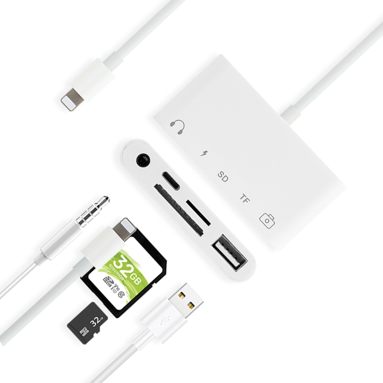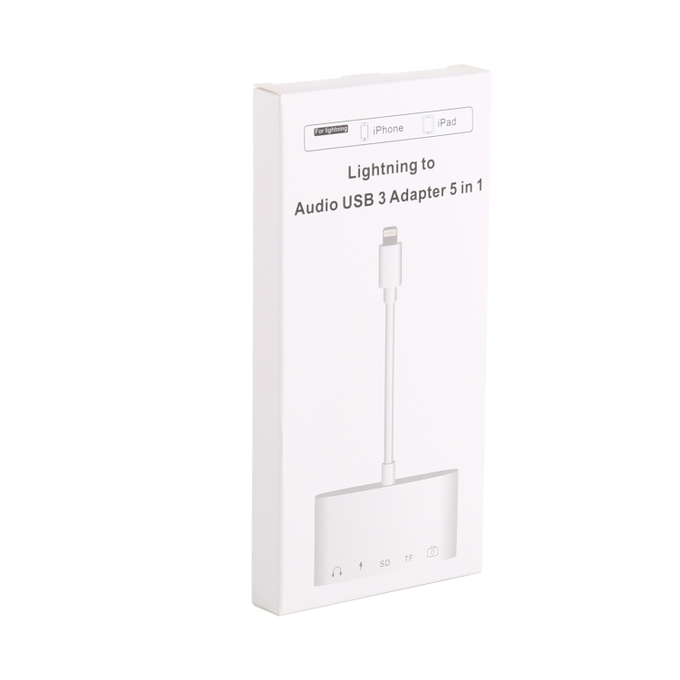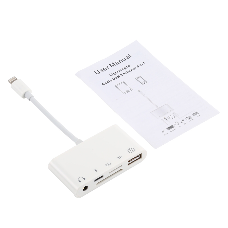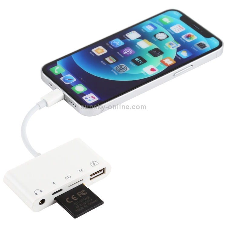 4. Nota importante: El kit de conexión de cámara de audio 5 en 1 tiene 5 puertos. Excepto puerto USB. El puerto SD, el puerto micro SD no se pueden usar al mismo tiempo. El otro puerto se puede usar al mismo tiempo, puedes escuchar la música y poner el tipo de teclado al mismo tiempo. Si utiliza un disco flash USB / tarjeta Micro SD / tarjeta SD directamente con este kit. Debe crear una carpeta DCIM.