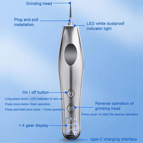 • Velocidad máxima de 20,000 RPM; Batería de 500mA; iluminación LED Frontal; sistema de amortiguación incorporado; función a Prueba de Polvo