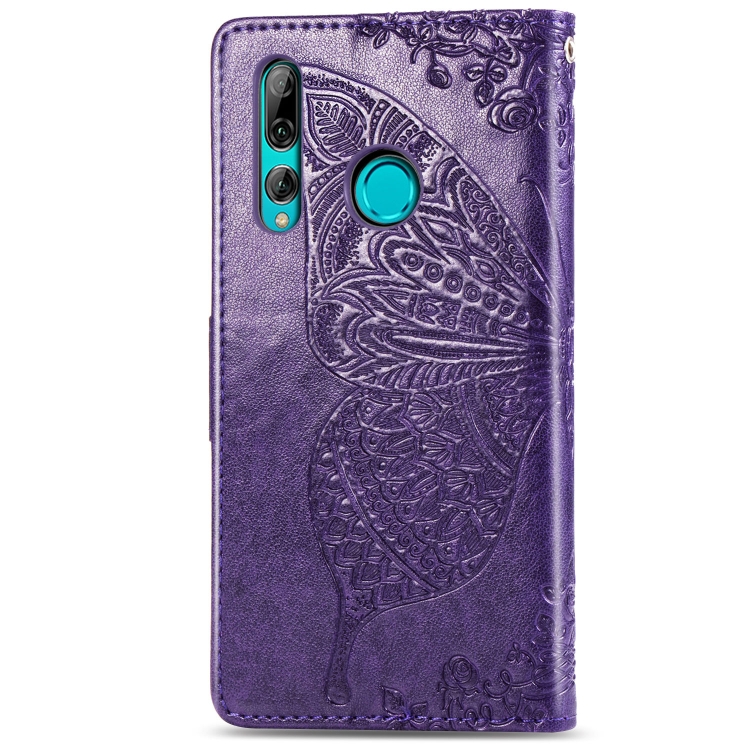 Funda de Cuero Butterfly Love Flowers para Huawei Y9 Prime (2019) con Tapa Horizontal, Soporte, Ranuras para Tarjetas, Billetera y Cordón (Morado Oscuro)