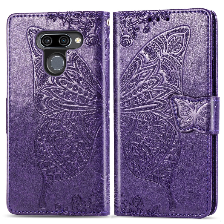Funda de Cuero Butterfly Love Flowers para LG K50 con Tapa Horizontal, Soporte, Ranuras, Billetera y Cordón (Dark Púrpura)