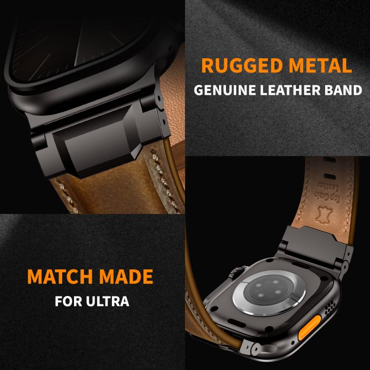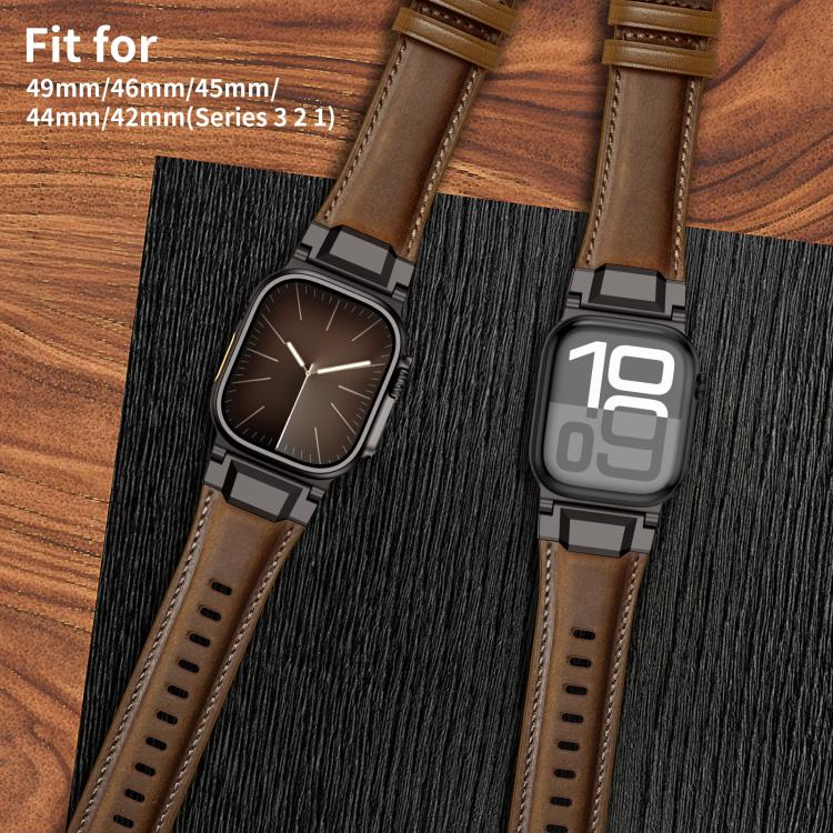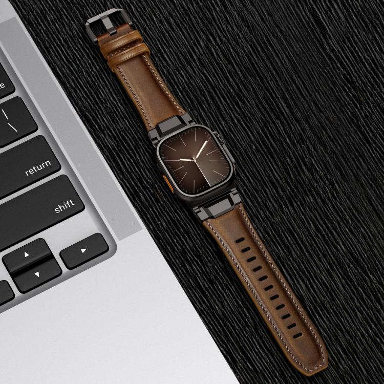 Correa de cuero estilo armadura para Apple Watch de 46 mm, 49 mm, 45 mm y 44 mm (nueva hebilla negra de cuero Crazy Horse marrón oscuro).