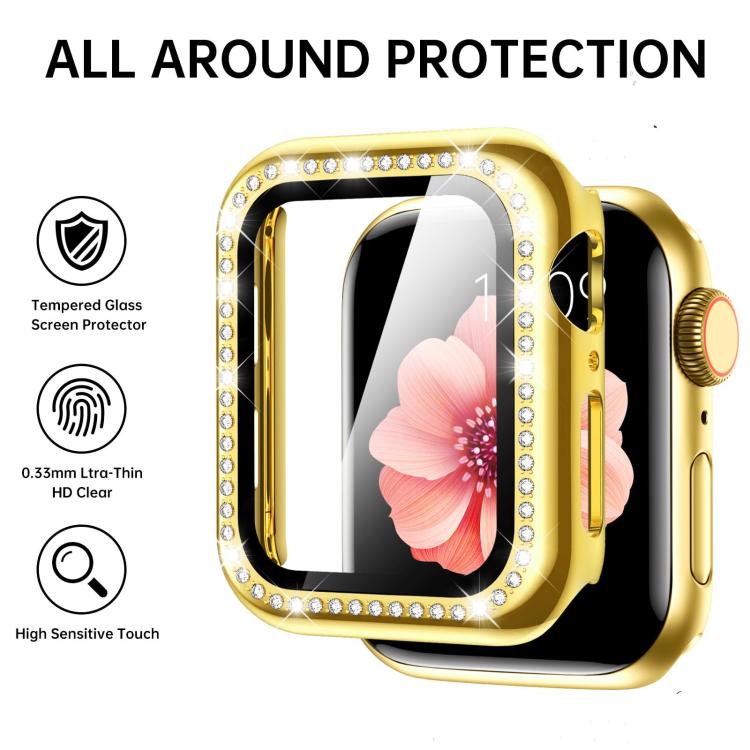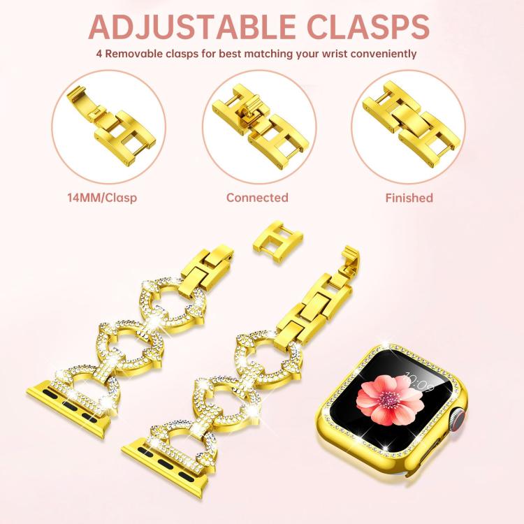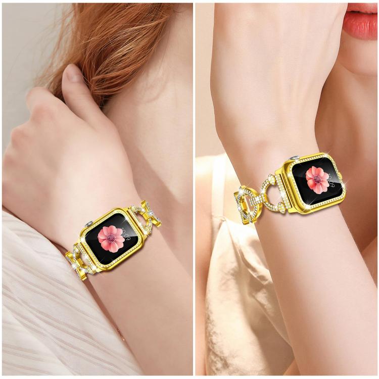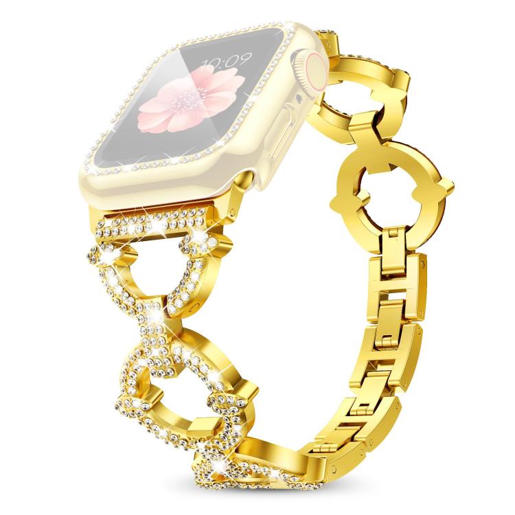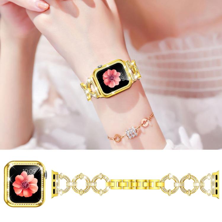 Correa de metal con diamante en forma de O y película templada integrada para Apple Watch Series 10 de 42 mm xDfind (dorada)