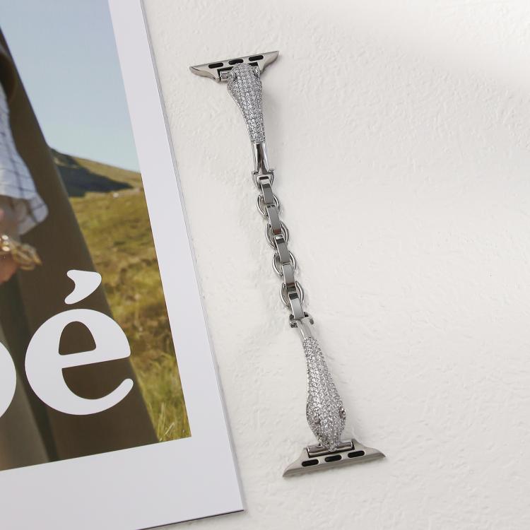 Correa de reloj con cabeza de leopardo y circonita incrustada de cobre para Apple Watch de 42 mm, 41 mm, 40 mm y 38 mm (plateada)