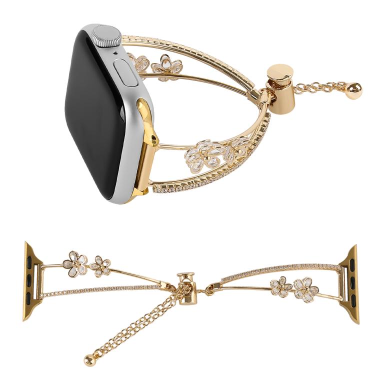 Correa de reloj con flor de cinco pétalos y circonitas incrustadas de cobre para Apple Watch de 46 mm, 49 mm, 45 mm y 44 mm (dorada)